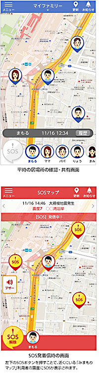 家族やグループ間で、お互いの居場所をマップで確認でき、特に災害時の安否情報の共有や周囲に救援を求めることにもつなげられる『みまもりマップ』サービスが2016年5月以降からスタートする。