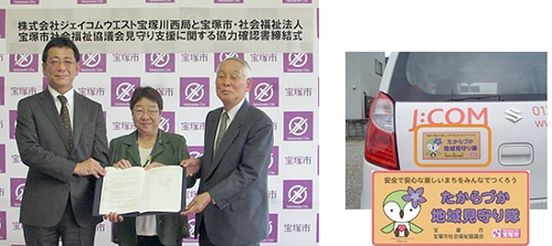 ジェイコムウエスト(本社:大阪市中央区)の宝塚川西局(所在地:宝塚市小浜)では、同局のサービスエリアである兵庫県宝塚市、そして社会福祉法人宝塚市社会福祉協議会(宝塚市安倉西)が取り組んでいる、高齢者の見守り支援活動『たからづか地域見守り隊』への参加に合意、協定の締結にいたった。