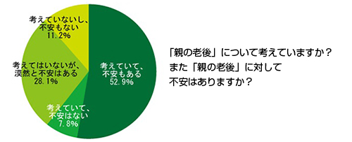 今回の調査では「親の老後について考えているか」「親の老後に対して不安はあるか」「親の老後について不安要素はなにか」「もしも親の介護が必要になった場合はどうするか」「親の老後に備え、何か対策はしているか」などの設問が用意された。