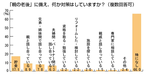 小紙『みまもりジャーナル』でもっとも注目したのは「親の老後に備えて何か対策はしているか」という質問で、「貯金=17.1%」「親と話し合っている=8.9%」「兄弟・姉妹間で話し合っている=7.8%」などの回答が低調に拮抗するなか、「特にない」との回答が「66.0%」と、3人に2人は「親の老後」に関して特に対策はしていないという実態が読み取れた。【YG】