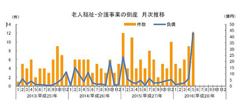 昨春からの介護報酬改定の影響を受けてか、2015年(1月〜12月)の「老人福祉・介護事業」の倒産は76件と過去最多を記録。(昨年は54件。前年比40.7%増)しかし、今年に入ってからは昨年中の反動もあり、前年同月を下回ることも多かったようだが、4月には「前年4件→本年9件」、そして5月に再び増勢の流れに転じている。