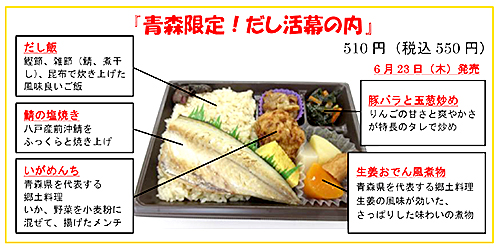 協定締結を記念して発売された商品群は、「地産地消」という考え方を軸として、青森県内の優良な原材料を使用した商品開発を通じて、地域の活性化に努めたもの。青森県の推進する「だし活」への 賛同で開発された、塩分を抑え、だしの旨味を効かせたお弁当のほか、県の原材料を使用したパンやデザート、地域でなじみの深いメニューを商品化した中華そばなど計4 品を順次発売してゆく。 【YG】