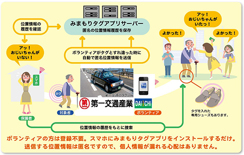 ALSOK(本社:東京都港区)では、九州に本社をおく第一交通産業(本社:福岡県北九州市)との共同で、地域が主体となって構築されてる「見守りネットワーク」を支援するため、BLEタグとスマートフォンなどを活用した「位置情報提供システム」をボランティアとして提供を開始する。
