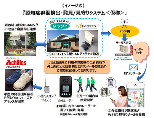 まず、アキレスが開発した「徘徊対策用の介護シューズ」に、加藤電機が開発した小型の発信機「SANタグ」を装着。さらにツクイのデイサービス内に、加藤電機が開発した「GEOフェンス型中継機SANアンテナ」を設置。このアンテナは「SANタグ」の電波を常に検出していて、見守り対象者が「見守りエリア」の外に出た場合、その離設を検出して介護職員や家族らにメール配信を行なうという内容で、短時間での行方不明者の捜索・発見につなげる。