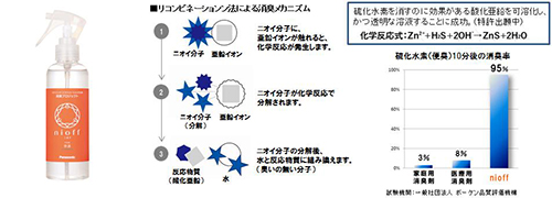 医療・介護現場での便臭・尿臭などの「におい対策」商品で、便臭の主要因である「硫化水素」を分子レベルで分解して消臭するプロユース消臭剤として『nioff(ニオフ)』がリリースされた。パナソニック エコソリューションズ化研(本社西宮工場:兵庫県西宮市)より。