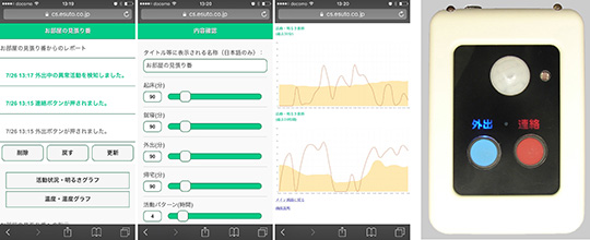 同サービスは「活動センサー、温湿度センサー、光センサー、赤外線信号発信機能」などが装備された『お部屋の見張り番=CS-500』の各センサーが収集した情報をもとに、例えば、高齢の親が住む部屋の室内温度が、設定値を超えてしまった場合などにはメールで知らせてくれる。そんなときは必要に応じて手持ちのスマートフォンからエアコンのスイッチをいれることもできるので、熱中症を未然に防ぐなどの対策にもつなげられる。