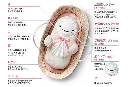 その他、マイクや加速度センサーが内蔵されていて、ユーザーの声の様子や抱き方に応じて笑ったり泣いたり、首を振ったり、くしゃみをしたりとさまざまな反応をする。