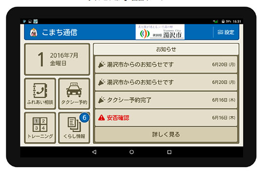 「見守り機能」は、使用者がタブレット端末を一定期間操作しない状態が続くと、地域の民生委員や市の担当窓口に通知されるというもの。また「乗り合いタクシーの予約機能」では、地域の乗り合いタクシー運行事業者との連携によって専用の「予約アプリ」が開発され、高齢者でも簡単にタブレット端末からタクシーを予約することができる。