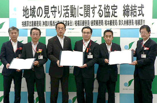 10月27日に行なわれた協定締結式には、それぞれ日本郵便・相模原古淵郵便局(神奈川県⻄北部地区連絡会)、相模原郵便局、座間郵便局、橋本郵便局、津久井郵便局の各局長と、加山俊夫市長が出席、協定書を交わした。