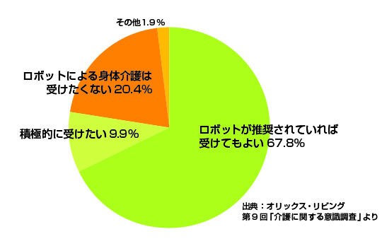 この中で、男女67.8%の人が「ロボットが推奨されていれば受けてもよい」と答えている。ちなみに「ロボットによる身体介護は受けたくない」と答えた人は20.8%という結果だが、介護ロボットの介護を「積極的に受けたい」と答えた9.9%の人を加えると、介護ロボットを肯定的に捉えている人は約8割に達していた。