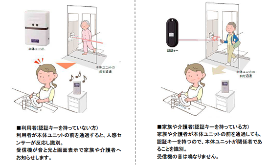 『認知症外出通報システム おでかけキャッチ』は、本体セットを玄関などに設置。認証キーを持たない見守り対象者がそこを通過すると人感センサーが反応して、家族や介護者に音と光、そして画面表示で通報してくれるというもので、2015年12月より発売されている。