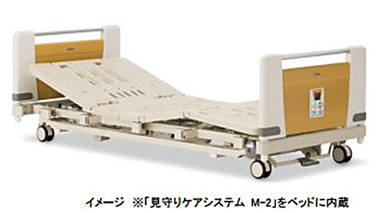 『見守りケアシステム M-2』は、ベッド利用者の離床動作を検知してナースステーションに通知する機能を装備していて、「動き出し」「起き上がり」「端座位」「離床」「離床管理」の 5 つの通知モードから選んで設定できる。併せて、寝たままの状態で体重を計れる「体重測定機能」や、介助時や食事の際にセンサー機能を一時停止しても再度検知を開始してくれる「自動見守り再開機能」などを標準搭載している。