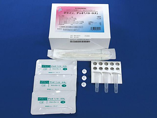 本製品は、糞便中の「ノロウイルス、ロタウイルス」の同時検出が可能で、検体をキットに滴下するだけの簡単操作によって、15分で判定結果が得られるという迅速検査キット(陽性は5分から判定可能)。