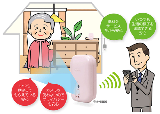 本サービスは、センサー内蔵「見守り機器」を見守り対象者の住居に設置。検知された人の動き・温度・照度などの変化をスマホ専用アプリからグラフなどで確認できるほか、あらかじめ設定しておいた条件でメール通知やプッシュ通知などを受けられるというもの。