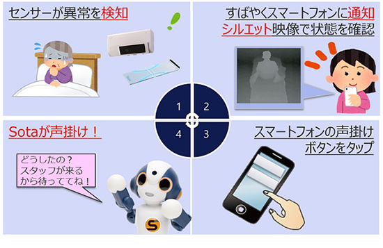 このサービスは、施設利用者のベッドサイドに設置されたセンサーとロボットが連動して、利用者の状態検知、介護スタッフへの通知、ロボットからの声掛けなどを行なうことができるというもの。
