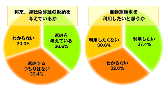 高齢者の運転による自動車事故が報道に目立つ昨今。今回の調査では「将来、運転免許証の返納を考えているか」「何歳くらいで運転免許証を返納しようと思っているか」「運転免許証を返納しない理由は何か」「自動運転車を利用したいと思うか──」などの設問が用意された。