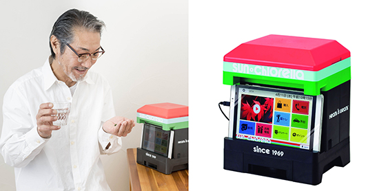 新製品『oneness』(写真)は、「ディスペンサー」と「タブレット」からなるサポートアイテムで、主に(1)「飲用サポート機能」(2)「認知機能活性化トレーニング機能」(3)「見守り通知」(4)「サン・クロレラコンシェルジュ」の「4つのサポート機能」を搭載している。