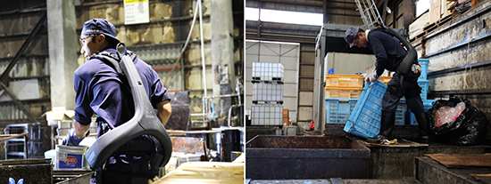 今回『ATOUN MODEL Y』が導入されたのは、回収されてきた肉脂(牛脂や豚脂)を容器から取り出す抜缶作業現場で、肉脂の回収は容器の種類や形状が一定ではないため機械化・自動化が難しく、特に籠に入った肉脂は相当な重量になることから腰に負担がかかるのだという。そこで、作業者の身体的負担を軽減するとともに、作業効率を向上させるという目的のもと『ATOUN MODEL Y』の導入にいたった。