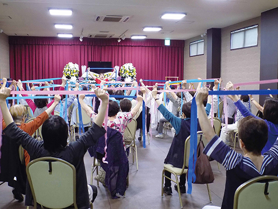 「少子高齢化」「人口減少社会」「独居高齢者」など、様々な課題が叫ばれるなか、同社では「世帯という血縁的なつながりのみならず、地域・社会全体において支えていくことが大切である──」と主張。温かな地域の輪、街づくりに貢献する活動に取り組むなかで、「そよ風コンサート」「布ぞうり教室」「グラウンドゴルフ大会」「ちぎり絵教室」「絵てがみ教室」などを開催。用具を使って簡単にできるという「3B体操」なども人気のイベントだという。
