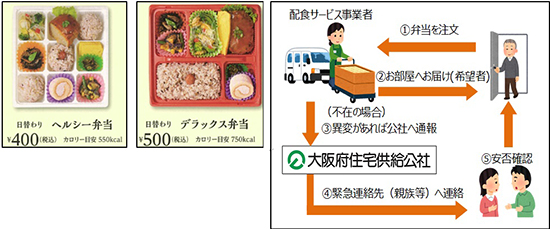 また、弁当を買うために販売所に来ることで、他の人との関わりをもつ機会を創出したり、さらに希望者には玄関先への配達も実施して、「不在で応答がない」等の異変を発見した場合は、公社へ通報する。公社では親族等の緊急連絡先へ連絡し、安否確認につなげることで「高齢者を見守り、孤独死の防止」を図る。併せて、公社の『ふれあい訪問サービス』(公社の無料サービス)の周知も実施するという。