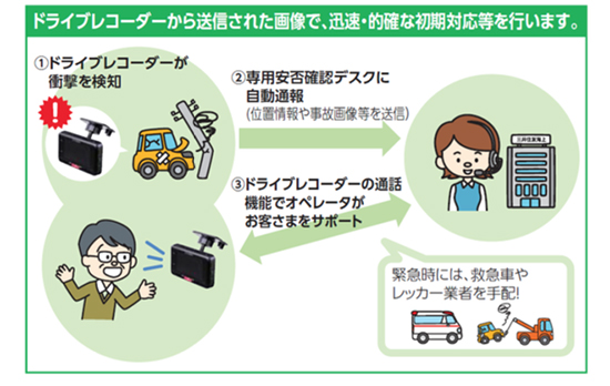 新自動車保険では、JVCケンウッド(本社:横浜市神奈川区)の「通信型ドライブレコーダー」と、最新の「テレマティクス技術(*)」の活用によって、事故発生時にドライブレコーダーの映像から事故状況を的確に把握して、ユーザーに対して具体的なアドバイスを行なうことが可能になるという。