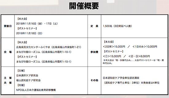 介護福祉事業者全般に向けて、多面的なスキルアップをバックサポートする日本通所ケア研究会(事務局:広島県福山市)では、『第17回日本通所ケア研究大会』および合同開催による『第14回認知症ケア研修会in福山』を、昨年に引き続いて実施する。(日程・概要などは下記を参照)