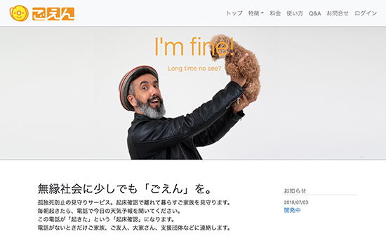 WEBサービス開発のダブミリ(本社:東京都品川区)では、「1日5円」で利用できる孤独死防止の見守りサービス『ごえん』の提供を開始した。まずはベータ版(試用版)の提供となる。