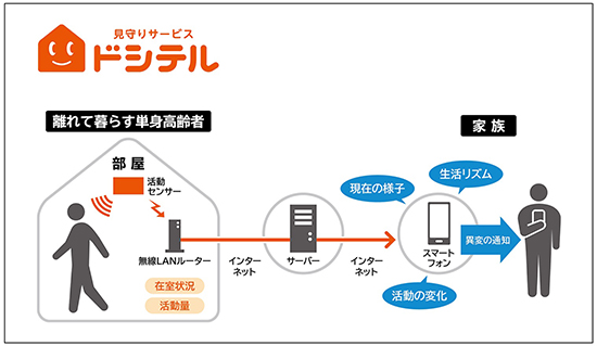 新サービス『ドシテル』は、単身高齢者の部屋の壁などに設置された「活動センサー」が、24時間365日、在室状況や活動量を検知するというもので、検知情報は無線LAN ルーターを通じて、サーバーに蓄積される。 家族は、専用のスマホアプリを通じて、単身高齢者の様子をリアルタイムで確認ができるという。