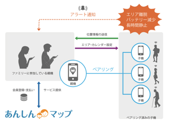 『あんしんマップ』は、子供や高齢者を対象とした見守りサービスで、「見守る側」のスマホと「見守られる側(たとえば子供や高齢者)」の端末に2種類のアプリをインストールし、ペアリングして使用するというもの。