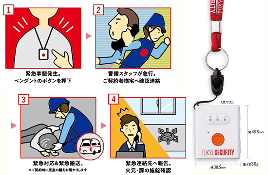 新サービスは「東急線沿線20市区に特化した地域密着の警備体制」を活かし、前述同様に万が一の際には自宅などの対象施設へ警備スタッフが急行するというもので、コンパクトな「緊急呼び出しボタン」は「SIMカード内蔵」で電話回線の開設や機器の設置工事などが不要という点も特徴。