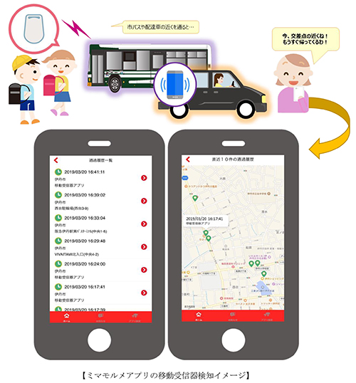 今回の実証実験では、既存の固定受信器に加え、市内を移動する車両に「移動受信器アプリ」をインストールしたスマホを搭載することで、この『まちなかミマモルメ』の検知エリアを広げ、サービスの強化を図るのが狙いだという。