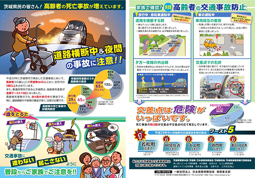日本損害保険協会・南関東支部茨城損保会(東京都千代田区)では、茨城県警察、茨城県などと連名で、「高齢者交通事故防止啓発チラシ(A4判・両面カラー)」を11万部作成。同県警察・同県、また、損害保険会社、同県損害保険代理業協会などを通じて、茨城県民に配布されるという。同県内で高齢者の交通事故死者数が多い現状を踏まえてのこと。
