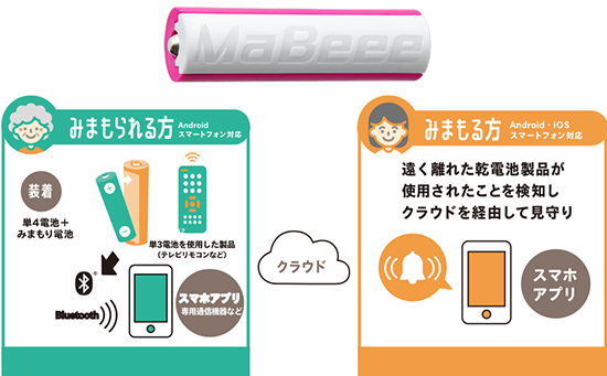 『MaBeeeみまもり電池』は、「見守られる側(例えば高齢の両親など)」の自宅に設置する単3電池を使用した製品(テレビリモコンなど)に装着することで、電流・電圧の利用状況をスマホの「Bluetooth」を経由してクラウドに通知。IoTBASEが提供する「見守る側」のアプリ『スマート電池』でその利用状況の変化を可視化して、見守りにつなげるというもの。