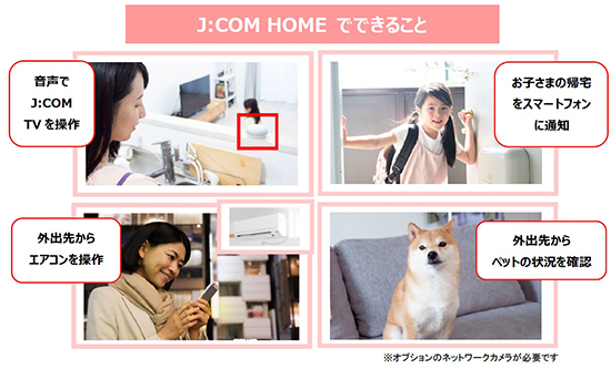 『J:COM HOME』は、外出先から、自宅ドアや窓の「開閉確認」や玄関の戸締りを確認できる『見守りパック』と、スマートスピーカを使って「家電操作」を可能にする『家電パック』を中心とするサービス。その他、様々なライフスタイルに合わせたオプションが用意されているという。