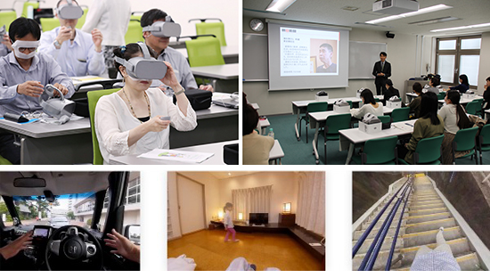 本プログラムは、受講者が一方的に聴講するものではなく、「体験型」として進んでゆくのが特徴。「VR(ヴァーチャル・リアリティ)ヘッドセット」を装着して、認知症の人が見えている世界を疑似体験(朝日新聞認知症VR)する。