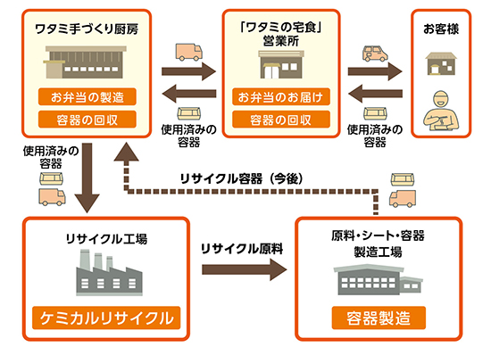 日替わり夕食宅配の『ワタミの宅食』(運営:ワタミ/東京都大田区)では、関西・中京圏で宅配される配食用の容器を、「バイオマス素材」を含んだプラスチック容器に変更する。また、それに並行して「バイオマスプラスチック容器」を回収し、リサイクルする取り組みのエリアを拡大する。