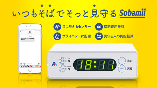 『Sobamii』は、テレビなど家電製品につないでコンセントへ挿すだけで設置が完了。 その後、家電製品の「ON・OFF時」の使用状況などを設定することで、一定時間の連続使用・未使用を自動で検知。長時間使われていないときは「異常」と判断して「SMS(ショートメール)」で通知が届くというしくみ。本体に携帯電話モジュールが搭載されていることでアプリなどを介さず、デバイスにダイレクトに通知が届くのが特徴。