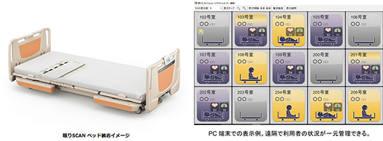『眠りSCAN』は、医療・高齢者施設などで、入居者の見守りや生活状態の把握などの目的で利用されている睡眠計測センサー。シート状のセンサーをマットレスの下に敷きこむだけで、身体に何も装着することなく、寝返りや呼吸、脈拍などの体動を検出し、利用者の呼吸数や脈拍数、睡眠状態、覚醒、起き上がり、離床動作などを遠隔でもリアルタイムで把握することができるというもの。医療・高齢者施設などでは、介護者の負担軽減のために活用されているという。