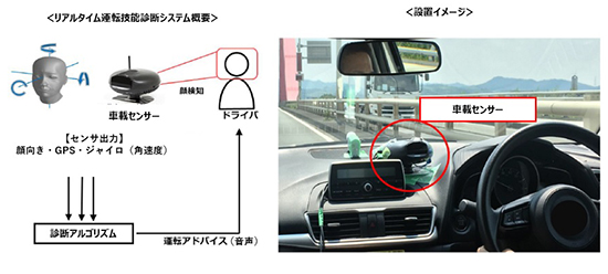 今回開発された「リアルタイム運転技能診断システム」は、車両に取り付けられた『DriveKarte』のカメラやセンサーから出力されるドライバー画像や、位置情報、加速度などの情報を組み合わせて、自動で運転技能評価が行われ、運転中のドライバーに対してリアルタイムに音声で危険運転を通知するというもの。