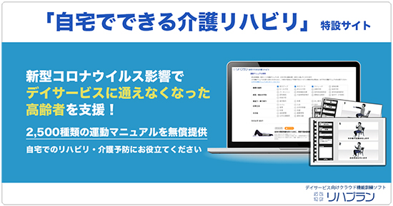 高齢者の「運動不足」「身体機能低下」を防ぐ緊急支援として、通常、リハプラン契約事業所のみに提供している約2,500種類の「運動マニュアル」を、希望者に無償で提供する『自宅でできる介護リハビリ 』特設サイトを公開した。