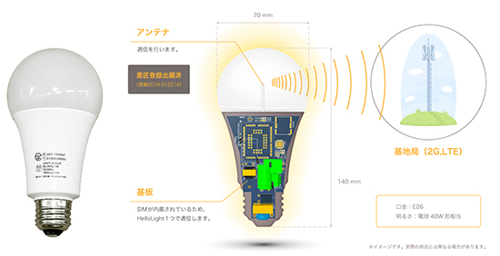 LED電球としては、一般的な「E26口金」を採用し、40W相当の明るさを実現。通常の電球と同様に特別な工事を必要ないという。(ハローライト株式会社はLPWA通信を高感度で実現するアンテナと発光ダイオード(LED)を電球として実現した意匠権『登録第1652106号』を取得)