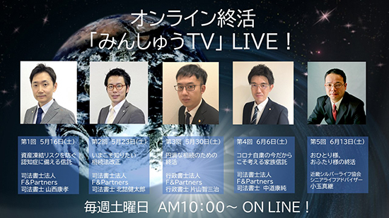 新たに配信がスタートした『みんしゅうTV』は、この5つのカテゴリーに関する専門家が毎週登場し、終活情報を提供する番組。司法書士、社会保険労務士、土地家屋調査士、行政書士、融資コンサルタントなど専門家をグループ傘下に持つF&Partnersグループが、番組運営に専門家の立場で参画し、情報提供を行なっているという。
