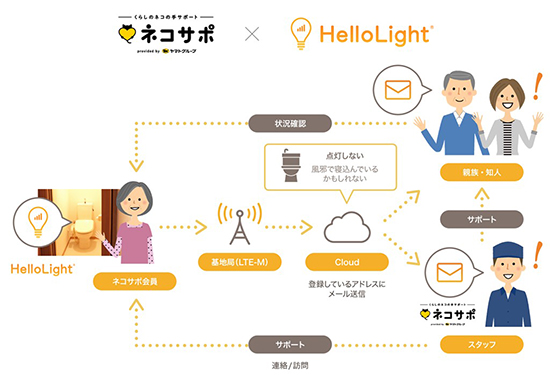 今回の取り組みは、『ネコサポ会員』の宅内に設置されたIoT電球『HelloLight』が一定時間ON/OFFしない場合、この電球が自律的にネコサポ会員の指定した親族や知人、そしてヤマト運輸ネコサポステーションに異常検知のメールを発信するというもの。