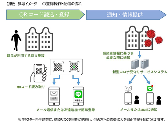 本サービスは、都立施設で新型コロナウイルス感染症のクラスターが発生した場合に、施設の訪問履歴に基づいて利用者に迅速に感染情報を通知するというもの。