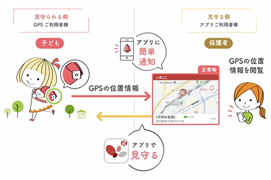 保護者は、子どもに持たせた『goo of thingsいまここ』専用GPS端末を通じて、現在地や行動履歴を確認することができる。また、アプリで事前設定した「危険スポット」に子どもが出入りした際の通知機能や、GPS端末のプッシュボタンで子どもが保護者へ現在地を知らせる機能なども搭載している。 【A.Yagisawa】
