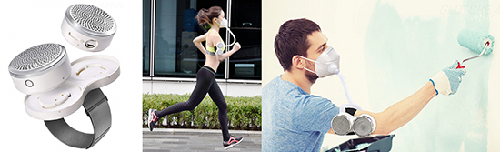 『FitAir』は独自設計によって「身につけて持ち歩くことができる画期的な空気清浄機──」として登場。製薬工場や医療現場で使用される、除去率の高い「H13グレード」のHEPAフィルターを内蔵し、「一般的なアレルゲン(花粉、カビ、ペットのふけ、チリダニ)、煙、0.3μmまでの微生物、PM2.5を効果的に除去します──」としている。(同社発表資料より引用)