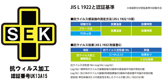 『SEKマーク』とは、「繊維評価技術協議会」(一般社団法人)が実施する認証制度(業界自主基準)に合格したものに表示される。同協議会では、抗菌防臭加工を施した繊維製品の表示用語、評価方法・基準、安全性などに自主基準を設け、基準に合格した商品には『SEKマーク』を表示するマーク制度を実施している。