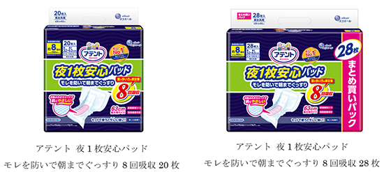 すでに「夜用パッド市場」の中で最も多く使用されているという「6回吸収」の使用者では、約2割がモレを経験しているといい、さらに、モレを経験した方の「約4割以上」がさらに吸収量(吸収回数)の多いパッドでモレの解消を求める傾向があるということから、今後も高吸収回数の需要が拡大していく見込みと注視する同社。「排尿量が多い方でも一晩中安心の『アテント 夜1枚安心パッド モレを防いで朝までぐっすり8回吸収』を新規発売し、モレにくさを求める生活者ニーズに幅広く応えていきます──」としている。 【A.Yagisawa】
