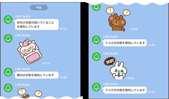『赤ちゃんうつぶせ寝検知アプリ』は、AIを用いて赤ちゃんのうつぶせ寝を検知するサービス。赤ちゃんの「睡眠姿勢」を判定し、「あおむけ(正常:緑)、横向き(注意:黄)、うつぶせ(危険:赤)をLINEやPCメールに通知してくれる。