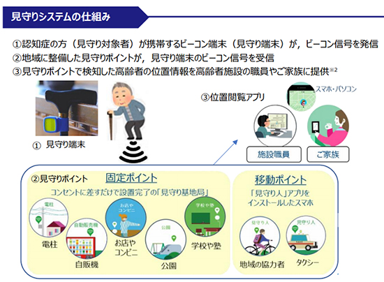 システムの具体的な仕組みは、(1)「認知症によって道に迷う心配のある人(=見守り対象者)」が携帯するビーコン端末(見守り端末)が、ビーコン信号を発信」(2)地域に整備した見守りポイントが、見守り端末のビーコン信号を受信(3)見守りポイントで検知した高齢者の位置情報を高齢者施設の職員や家族に提供するというもの。
